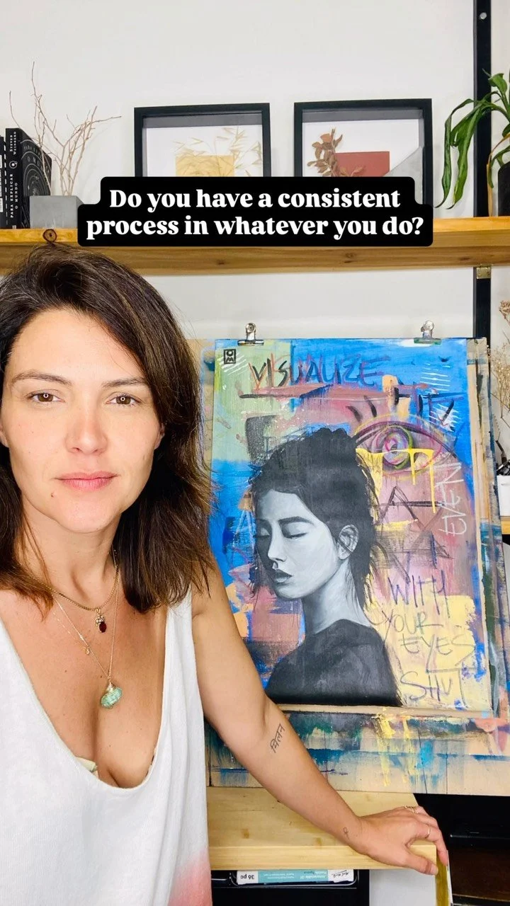 I start by creating backgrounds, letting movement and color decisions come from inside, no thinking, no planning. I often get some circled shapes, which I relate to the Sun, spiral and eye shapes. Those forms are something natural to my inner expression.