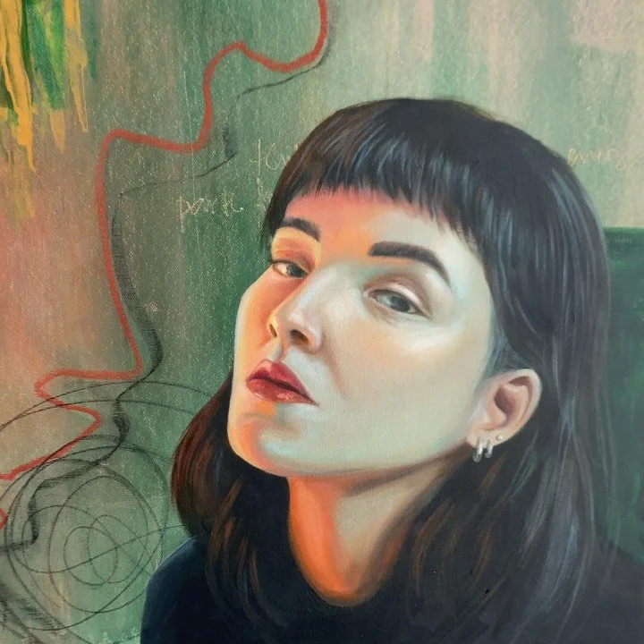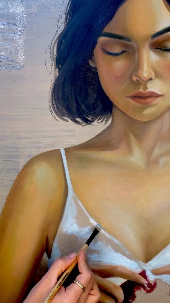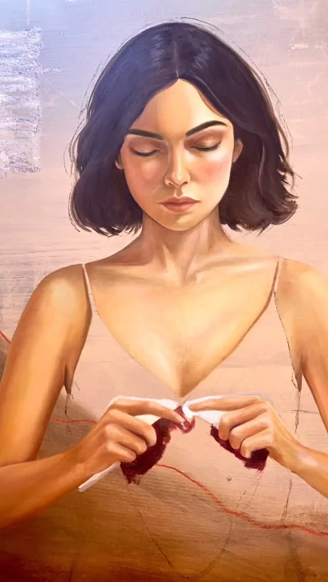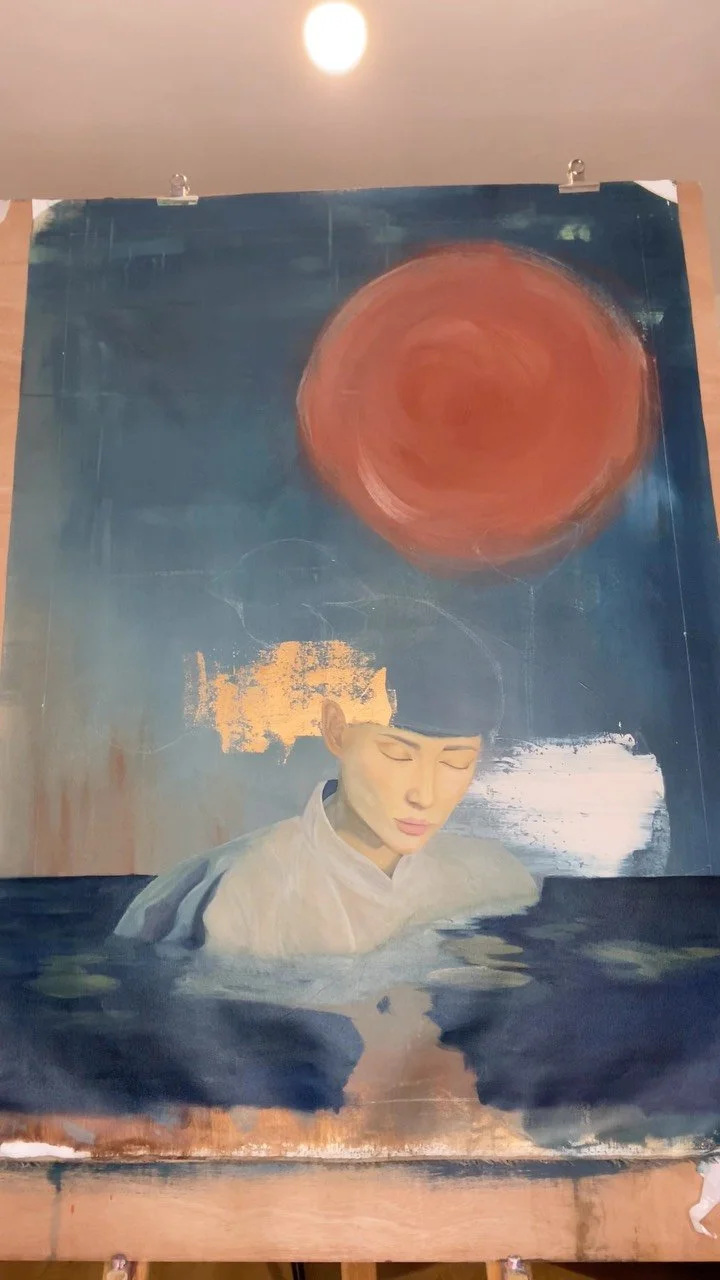 Next step, I take a photograph as a reference to what I feel like will match to things I wrote, and felt during the background painting process. Then the process starts being less intuitive and more technical by painting by reference.