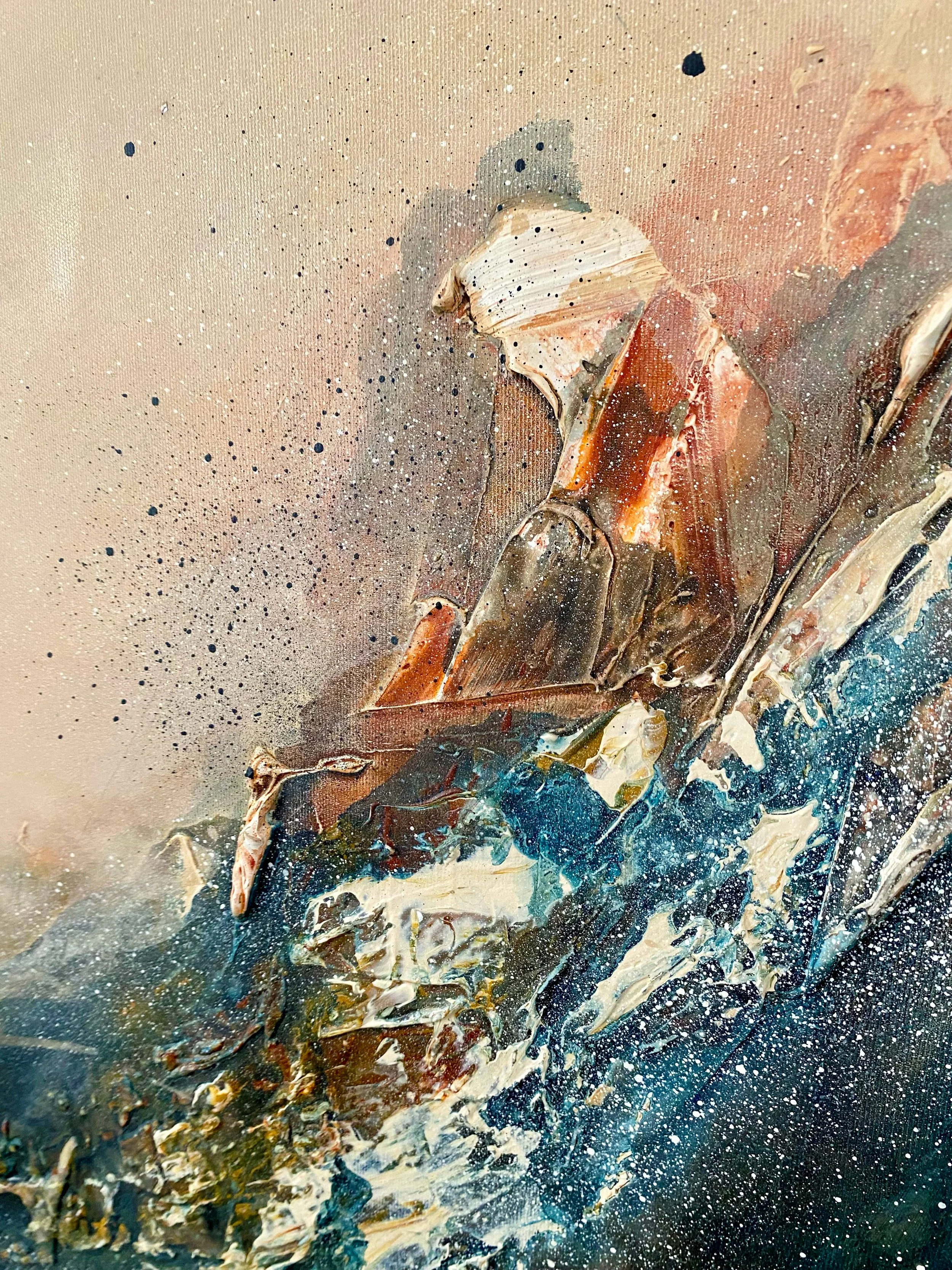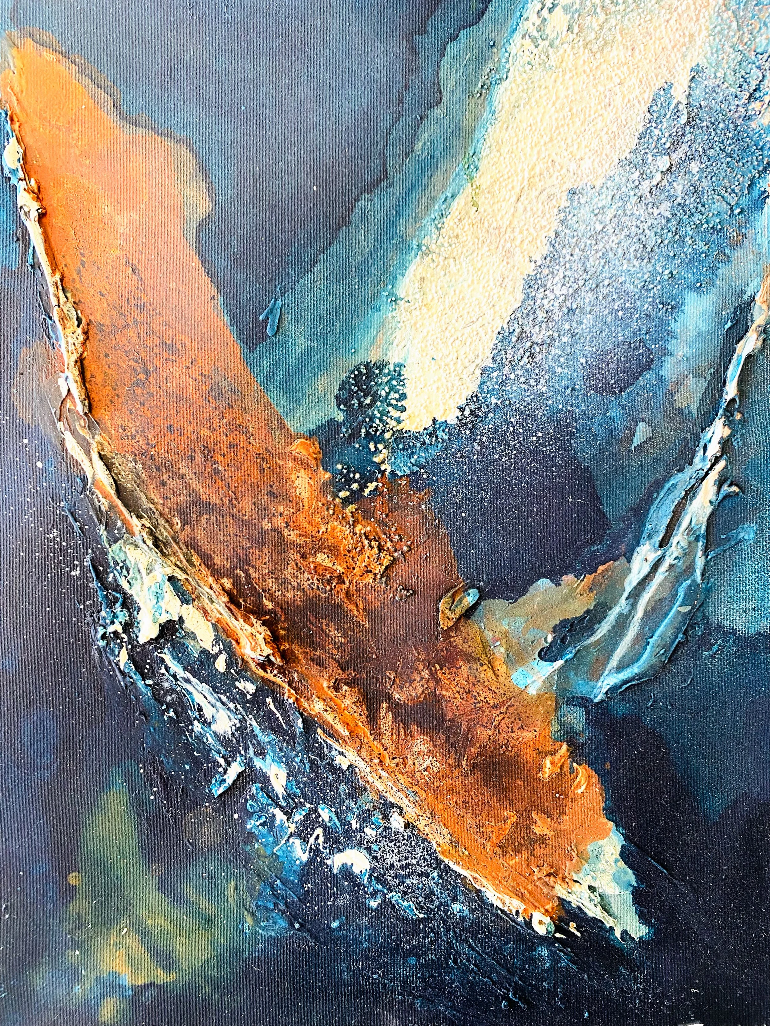 The process typically begins with preparing a canvas or panel by adding texture mediums to create a sculpted, three-dimensional base. This texture can be built up with tools like palette knives or spatulas to create raised areas, grooves, and patterns, adding a sense of movement and drama. Once the base layer is dry, fluid acrylics are poured over the surface. I often mix acrylic paint with a pouring medium, which allows it to flow more freely across the textured surface, creating beautiful, organic shapes and cellular effects.